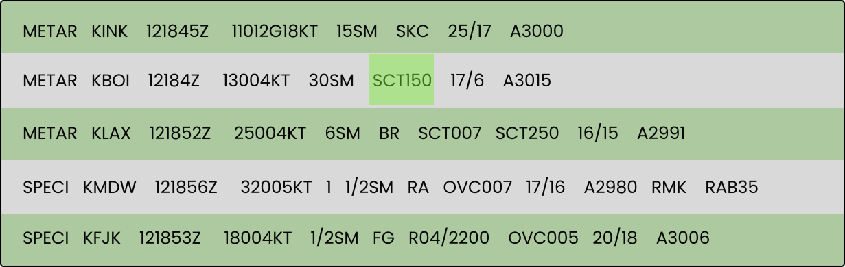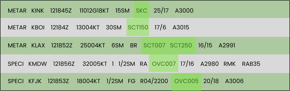 - Cloud Coverage Type (letters like SCT, BKN, OVC) – Which we reviewed in previous lesson.