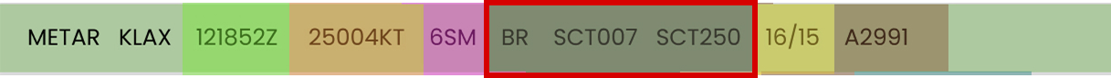 However, look at the highlighted section: BR SCT007 SCT250. This is where things get more complex. This highlighted section indicates the present weather as well as the cloud condition and their ceiling height.