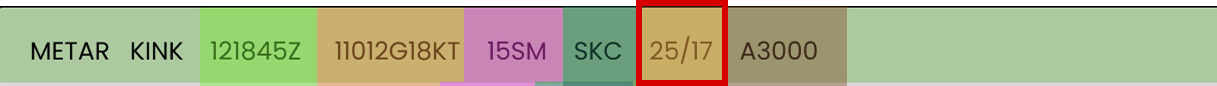 25/17 indicates the temperature and dew point in degrees Celsius, which are listed after the cloud coverage information.