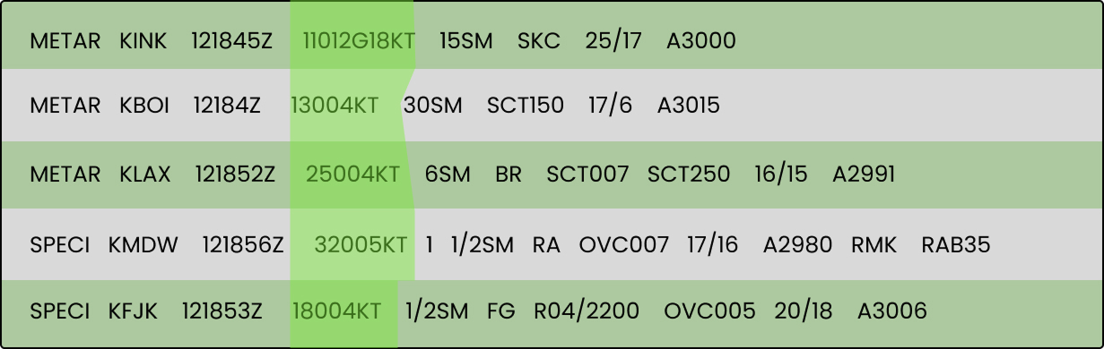 When checking on wind information using a METAR report you’ll see what direction the wind is blowing from, the wind speed in knots, and wind gust speed in knots.
