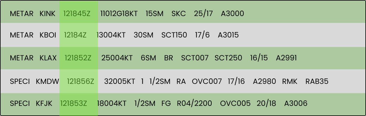 In the example above, we can see that the the METAR report for KINK was issued at 121845Z, meaning the 12th day of the month at 18:45 Zulu.