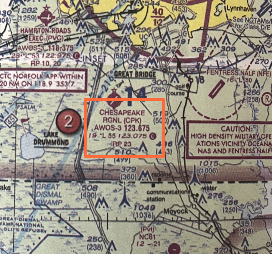 (Refer to Figure 20, Area 2.) Which radio frequency should you select to listen to manned aircraft announcing their approach to Chesapeake Regional Airport (CPK)?