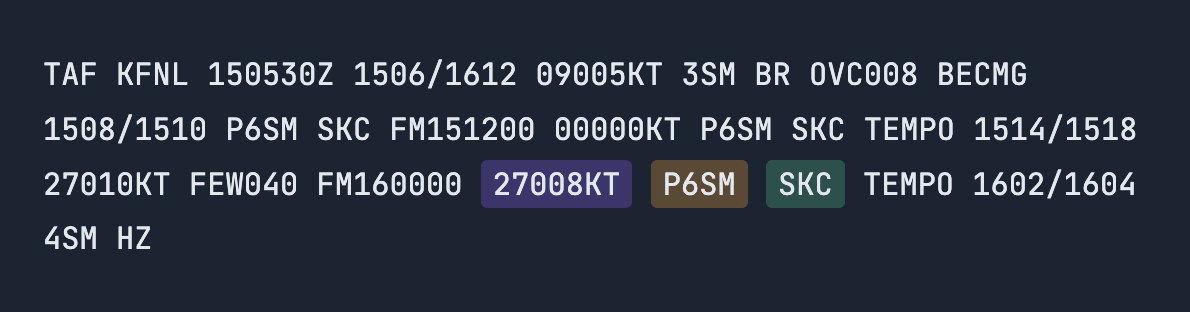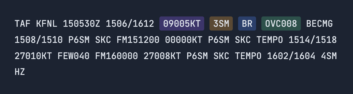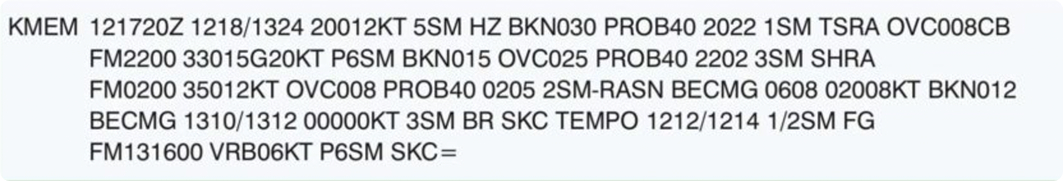 Now you need to interpret the wind speed and direction, visibility, present weather, and cloud coverage specifically forecasted for each period, all encoded in the TAF.
