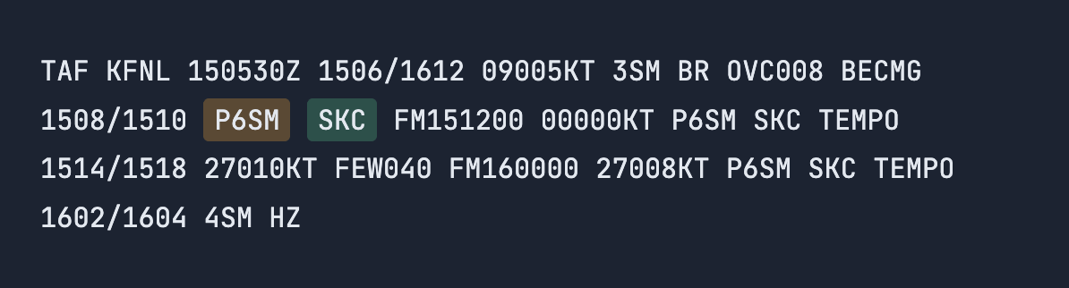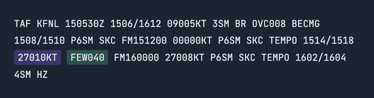 - FEW = Few clouds (1/8 to 2/8 sky covered)