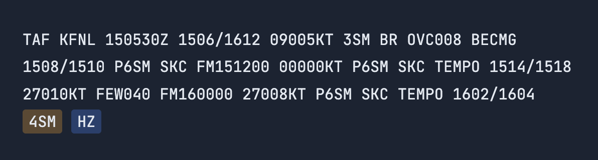 The forecast begins at 1506 (15th day at 06:00 Zulu = midnight local). Let’s decode all the weather elements for this period: