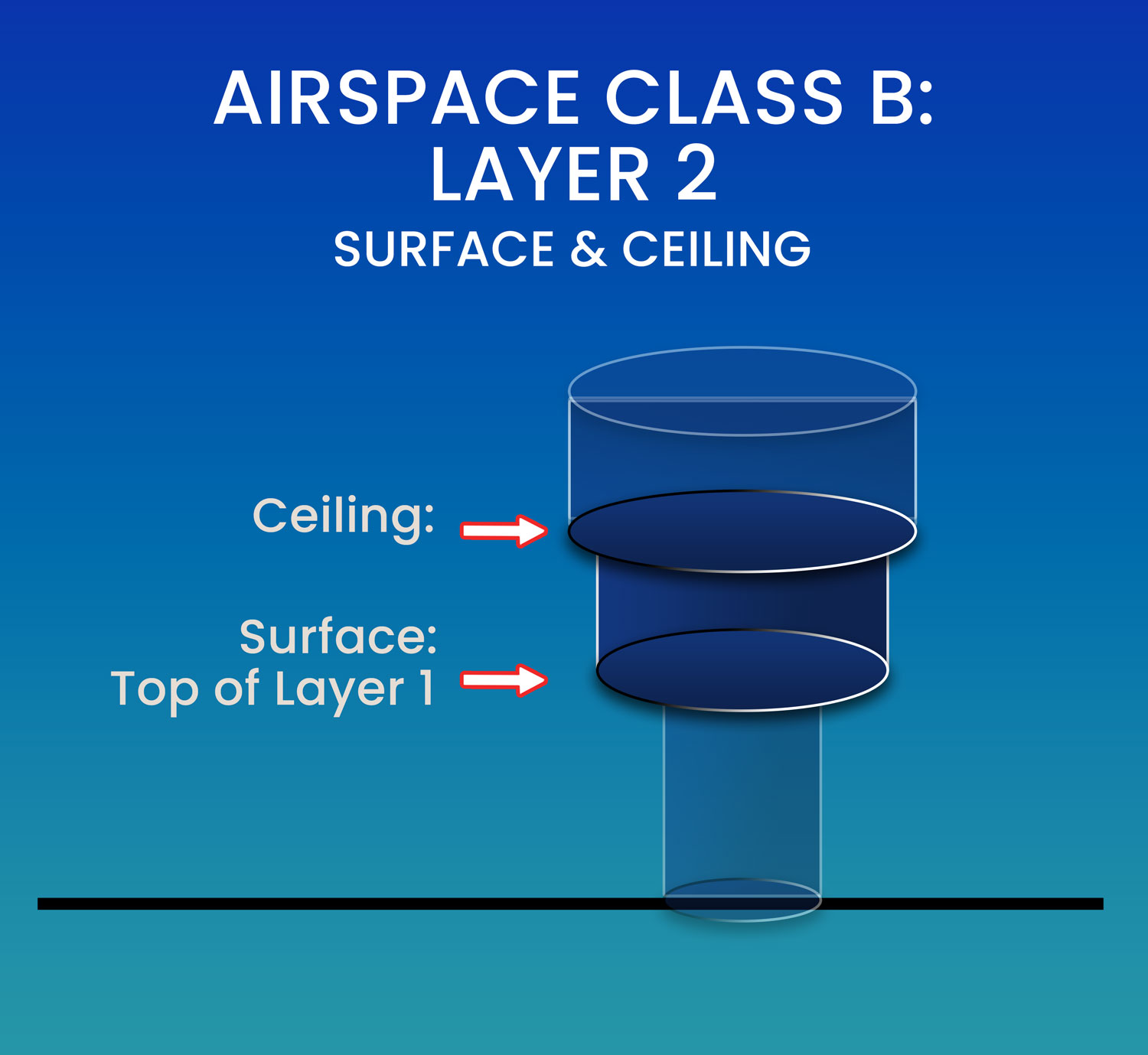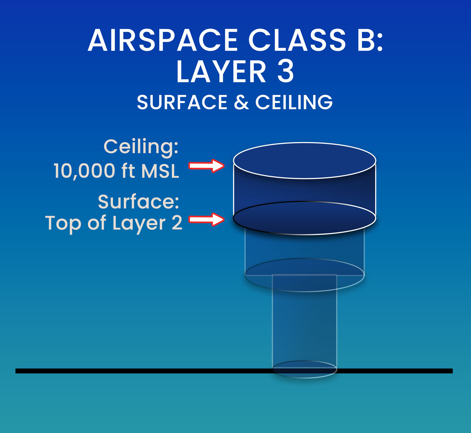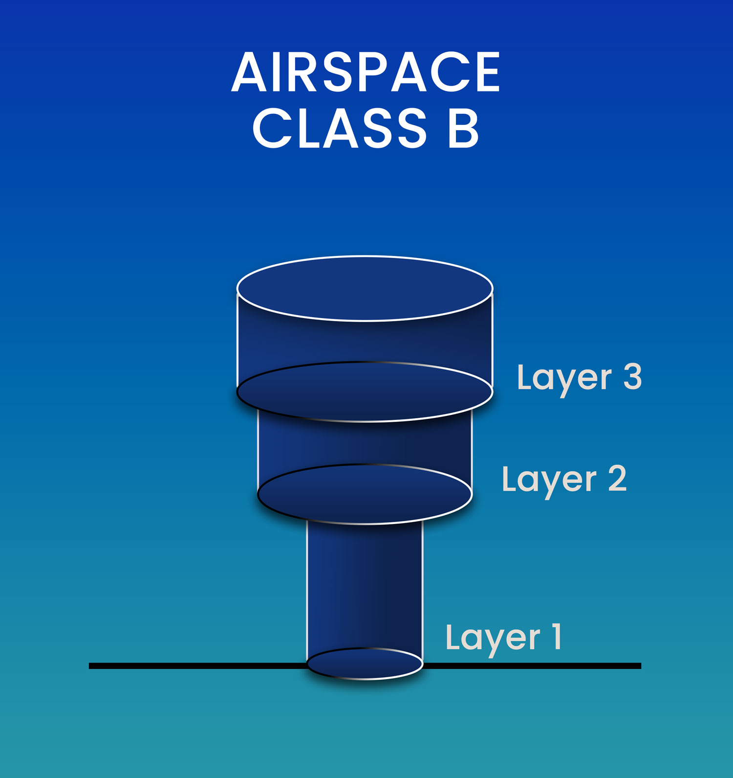 Layer 2 of Class B airspace sits above and wider than Layer 1, forming the middle tier of the “upside-down wedding cake” shape.